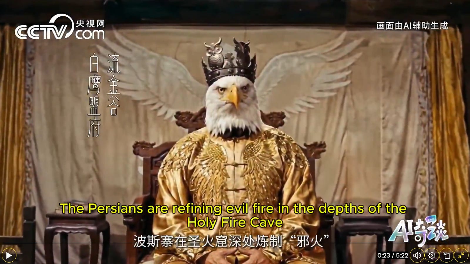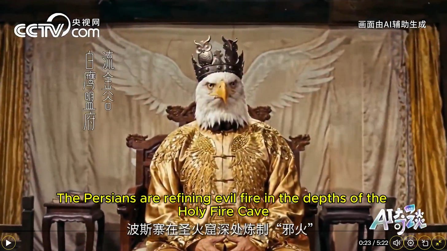 CCTV, the official government network of China, created a 4-minute AI cartoon video on the Iran war. English subtitles were added by Angelica, a resident of Taiwan. I suggest watching the video at half speed, because the dialog flashes by at a brisk pace. Double right click hard on the blank screen to get started.