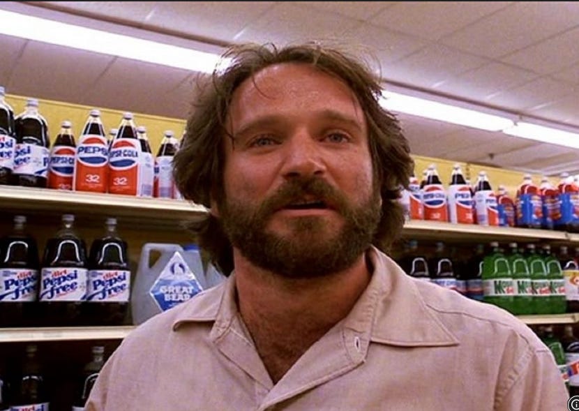 Below is a picture of Robin Williams in Moscow on the Hudson. Robin plays a defecting Russian saxophone player who is seconds away from fainting dead at the sight of 87 flavors of soda in an American grocery store. Note excellent Pepsi product placement.